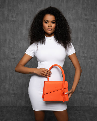 Introducing the Angelou Bag, Milano's first ever handbag. Designed for the leading lady, it boasts a sturdy top handle, features a flap opening, comes in three different colors (orange, neon and white), and has an embossed Milano Di Rouge logo on the front flap, giving it a lux finish for everyone to see. All bags come in a custom Milano Di Rouge box and dust bag. Each bag has an authenticity card.