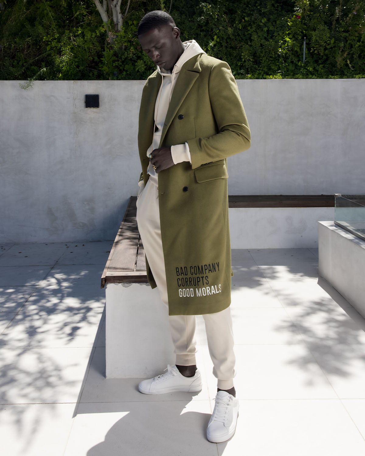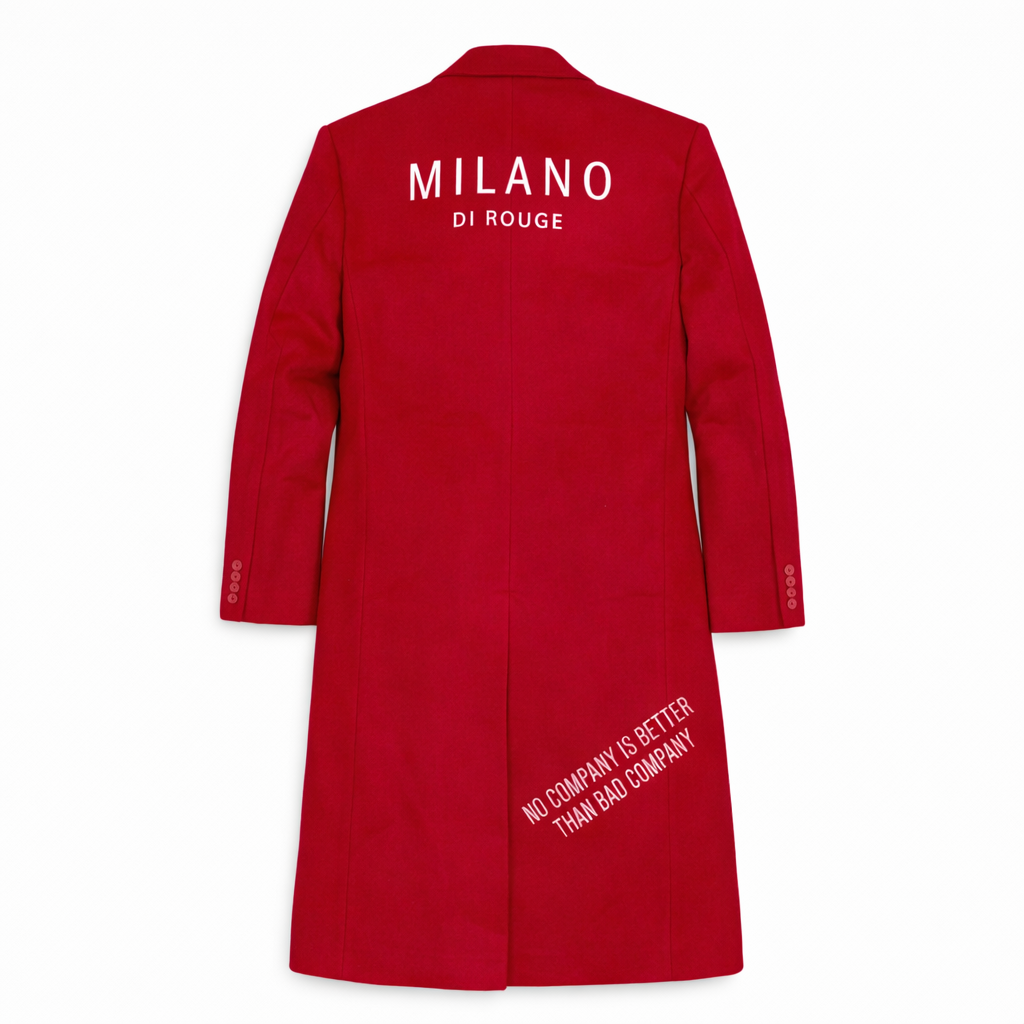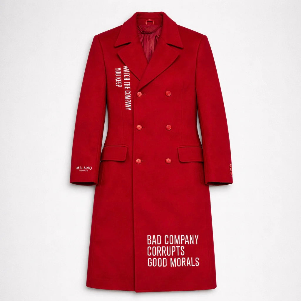A timeless, unisex calf-length, lapel-collared trench coat offered in tan and olive. Milano Di Rouge logo printed on the right-hand wrist. Detailed with dropped pockets and double-breasted buttons placed on the body panels. “Watch the Company You Keep” embroidered on the left-hand side. “Bad Company Corrupts Good Morals" stitched on the lower right-hand side at knee-length.