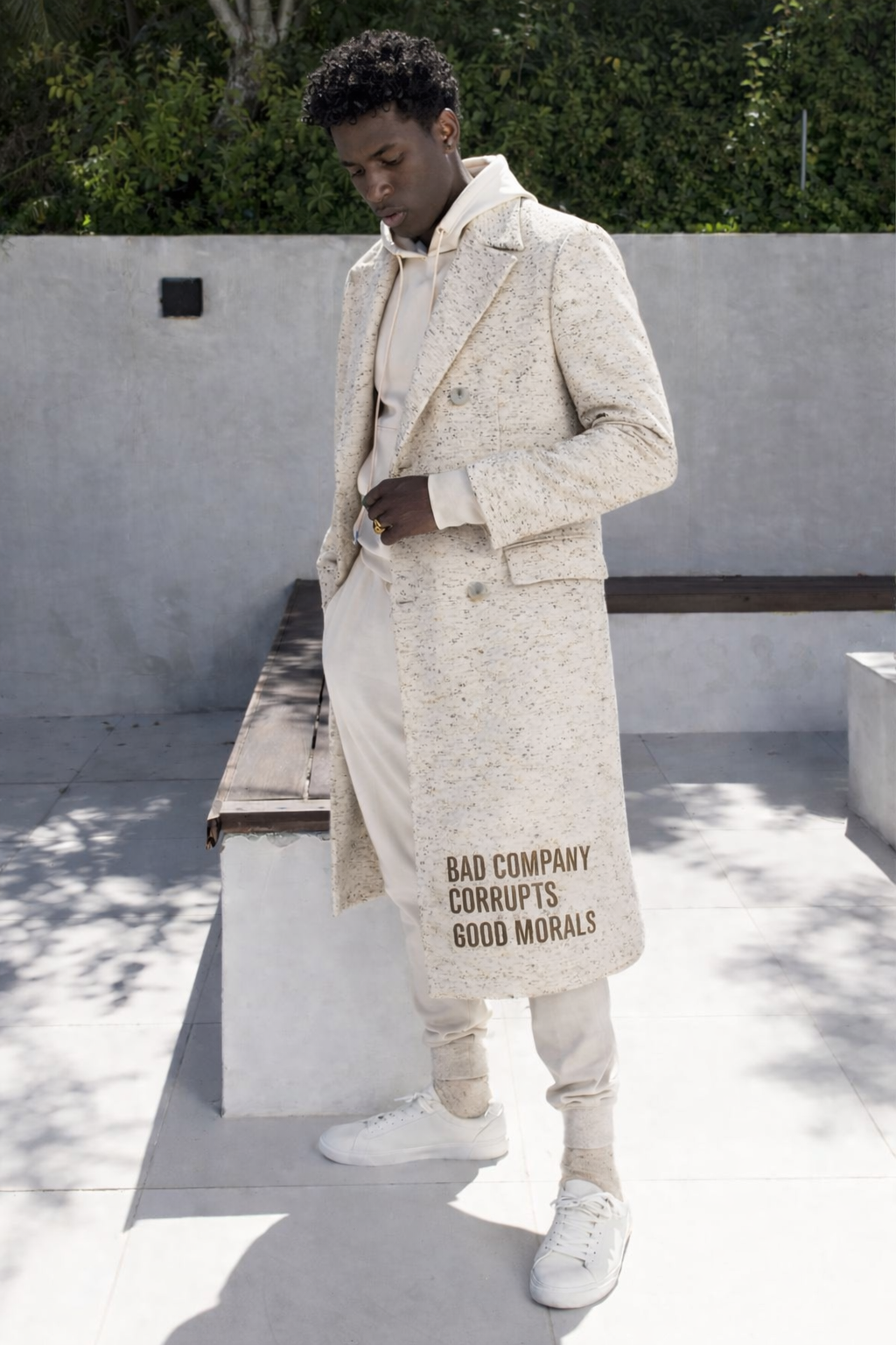 A timeless light weight, unisex calf-length, oareal colored trench coat. Milano Di Rouge logo printed on the right-hand wrist. Detailed with dropped pockets and double-breasted buttons placed on the body panels. “Watch the Company You Keep” embroidered on the left-hand side. “Bad Company Corrupts Good Morals" stitched on the lower right-hand side at knee-length.