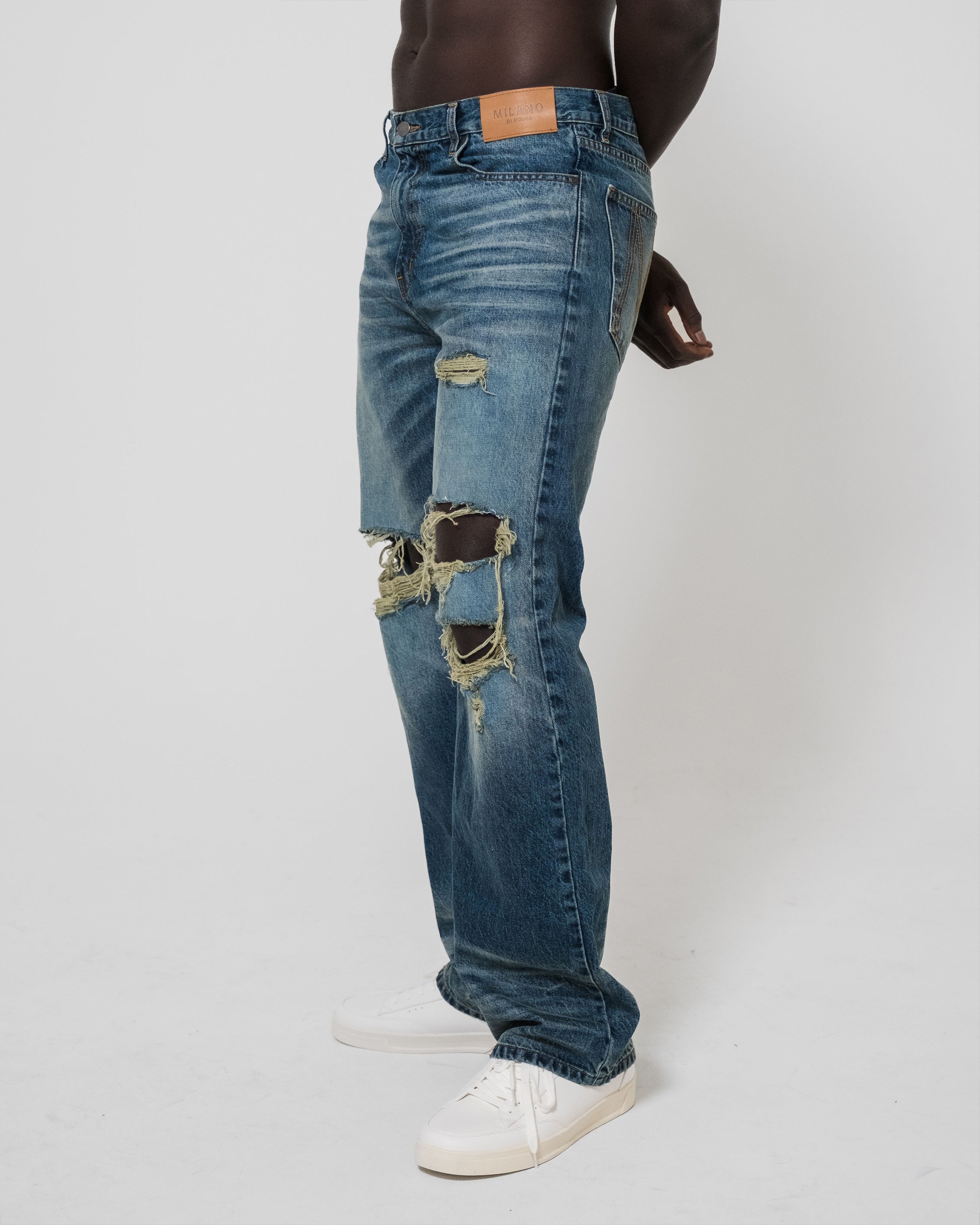 Crafted with a baggy, straight-leg fit, the Rari Denim delivers structure without restriction—balancing comfort and attitude in one statement piece. The distressed detailing is strategically placed to create depth and texture, giving the denim a lived-in edge while maintaining a polished, high-end finish.