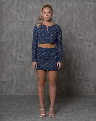 Sexy and Sophisticated! The Jaq Cardigan is a co-ord piece, the perfect for business, leisure, and pleasure. Available in 5 colors, The Jaq Cardigan is the perfect mixture of sexy and sophisticated a cropped, button down, long sleeve, round neck cardigan, with our Milano Jacquard signature print.