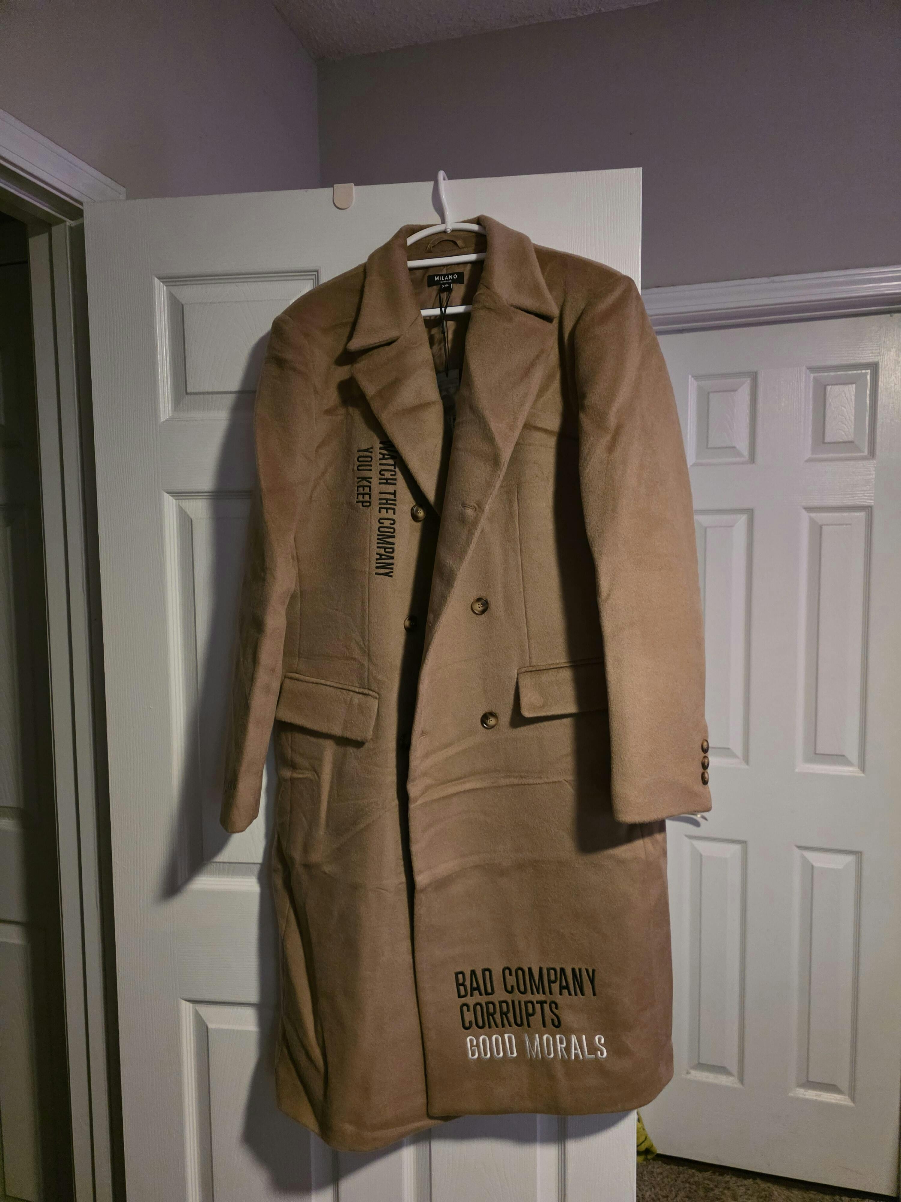 A timeless, unisex calf-length, lapel-collared trench coat offered in tan and olive. Milano Di Rouge logo printed on the right-hand wrist. Detailed with dropped pockets and double-breasted buttons placed on the body panels. “Watch the Company You Keep” embroidered on the left-hand side. “Bad Company Corrupts Good Morals" stitched on the lower right-hand side at knee-length.
