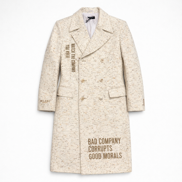 A timeless light weight, unisex calf-length, oareal colored trench coat. Milano Di Rouge logo printed on the right-hand wrist. Detailed with dropped pockets and double-breasted buttons placed on the body panels. “Watch the Company You Keep” embroidered on the left-hand side. “Bad Company Corrupts Good Morals" stitched on the lower right-hand side at knee-length.